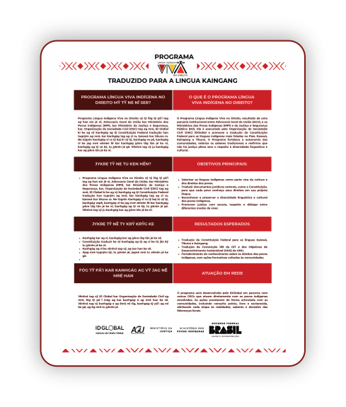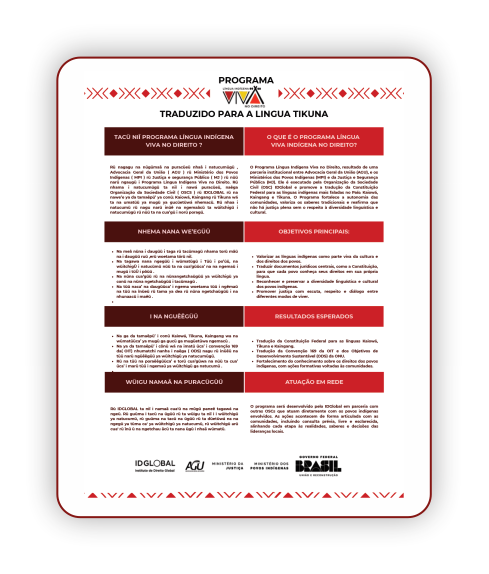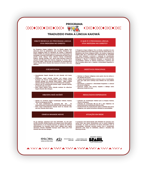 Com o objetivo de democratizar o acesso às informações sobre o Programa Língua Indígena Viva em todas as línguas contempladas (Tikuna, Kaiowá e Kaingang), foram elaborados banners bilíngues que apresentam, de forma acessível, o que é o Programa, seus objetivos, resultados esperados e a importância de sua construção em rede, realizada a muitas mãos. Esses materiais têm sido utilizados nos eventos realizados junto às comunidades participantes, fortalecendo o diálogo e a participação coletiva: